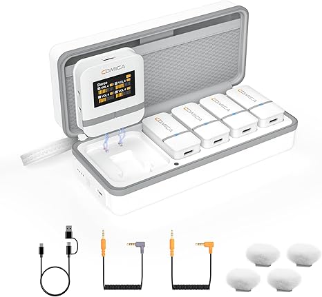 - 4-Channel Wireless Lavalier Microphone: Comica Vimo Q wireless mic comes with 4 Transmitters and 1 Receiver, which can pick up sounds from one or up to four people. Have great flexibility to meet your various needs on various occasions like Meeting Video Recording YouTube Podcast Vlog etc.