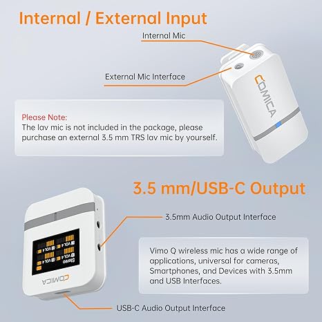 - Built-in or External Lav Mic: Comica Vimo Q wireless mic comes with a built-in microphone or 3.5mm lav mic as input modes for you to choose from. Adopts omnidirectional condenser radio, 360° surround pickup makes the sound more three-dimensional. (Please note: the lav mic is not included in the package)
